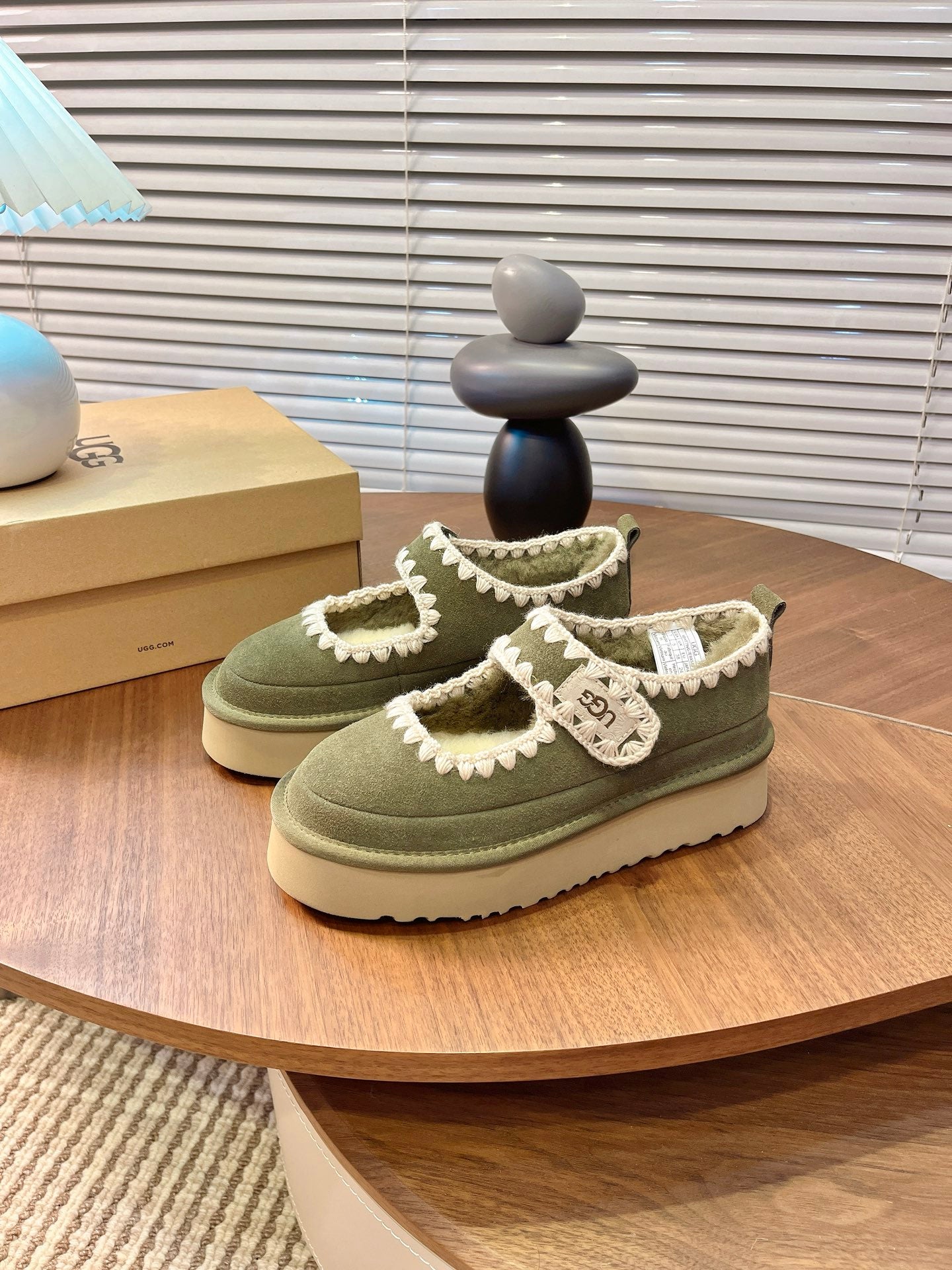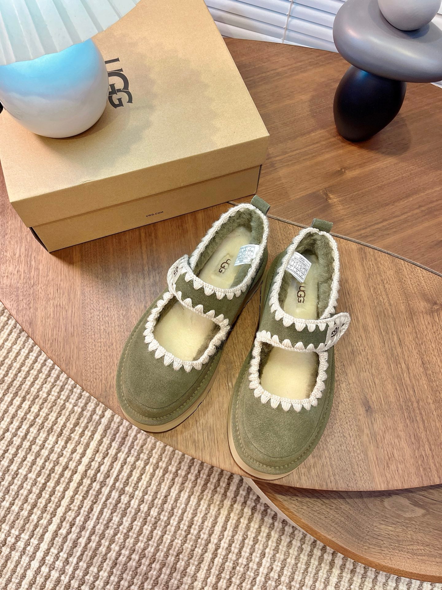 UGG Tazz Mary Jane Shoes Light Olive Green Suede Shearing