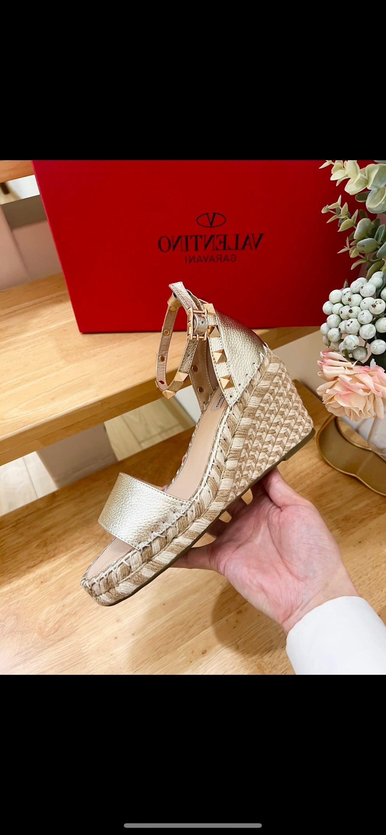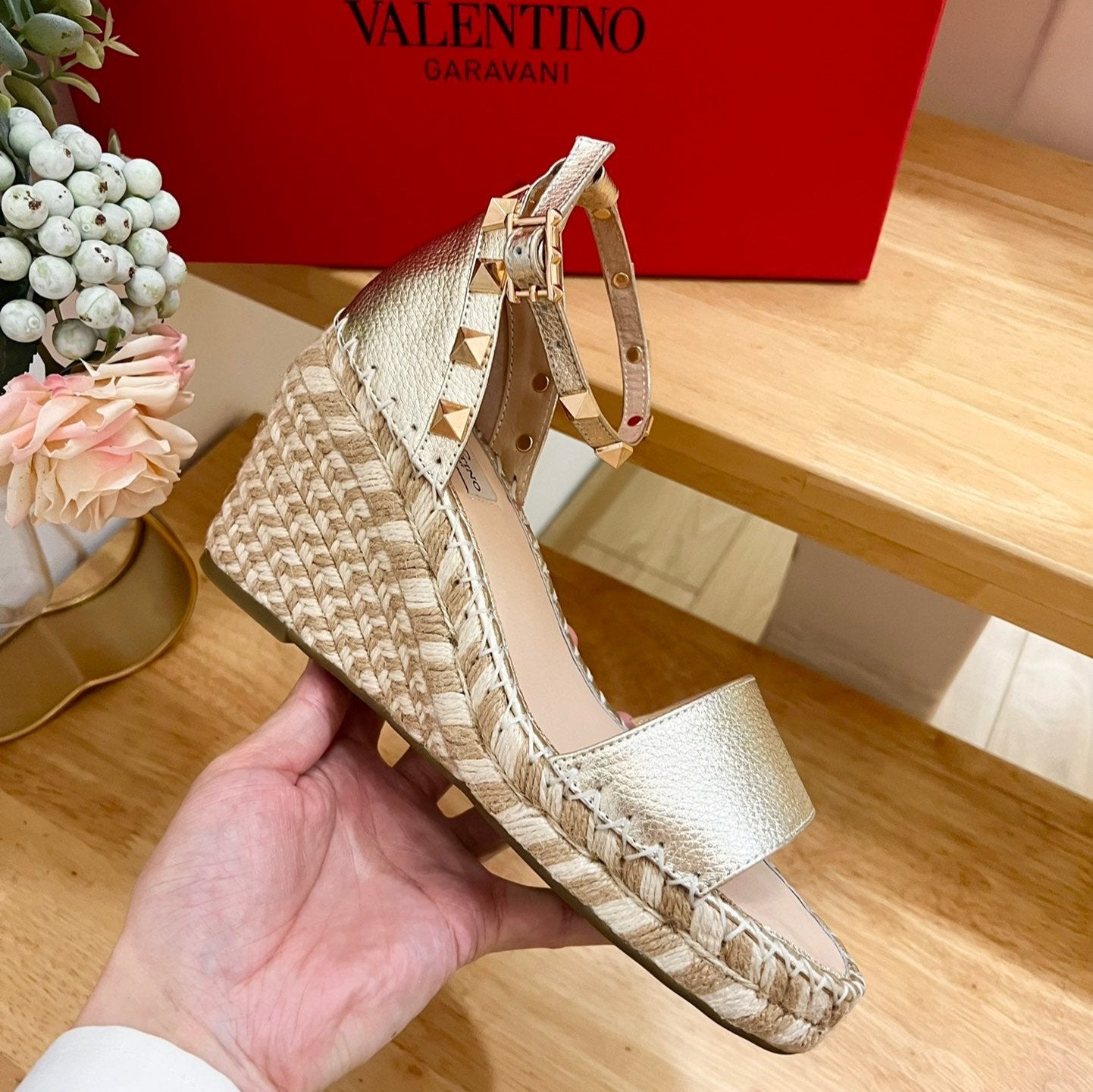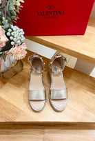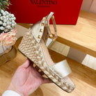 Double Rockstud Grainy Calfskin Wedge Sandal In Light Yellow Metallic Cowhide And Raffia 852841