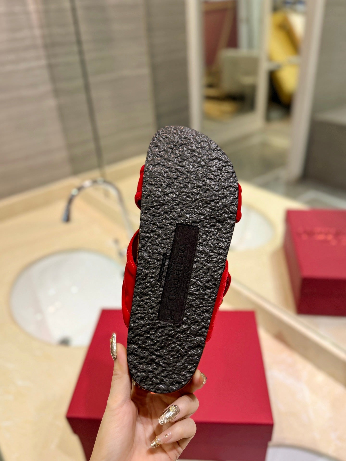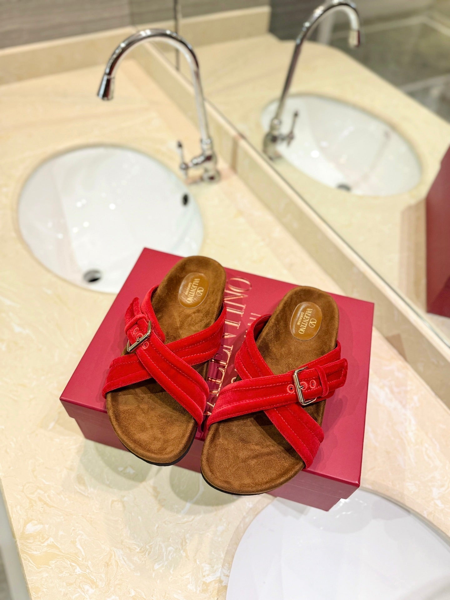 FUSSFRIEND CHERRY RED SILK VELVET SLIDE SANDALS
