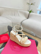GARAVANI ROCKSTUD WEDGE SANDALS IN WHITE CALFSKIN AND BEIGE RAFFIA
