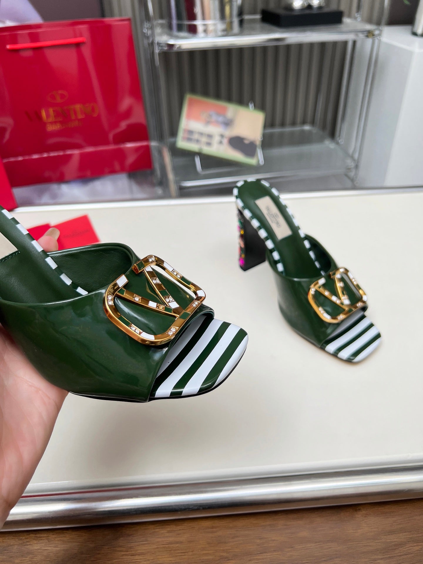 VT Vlogo High-Heeled Sandals 10.5cm Emerald Green Patent Leather 625761