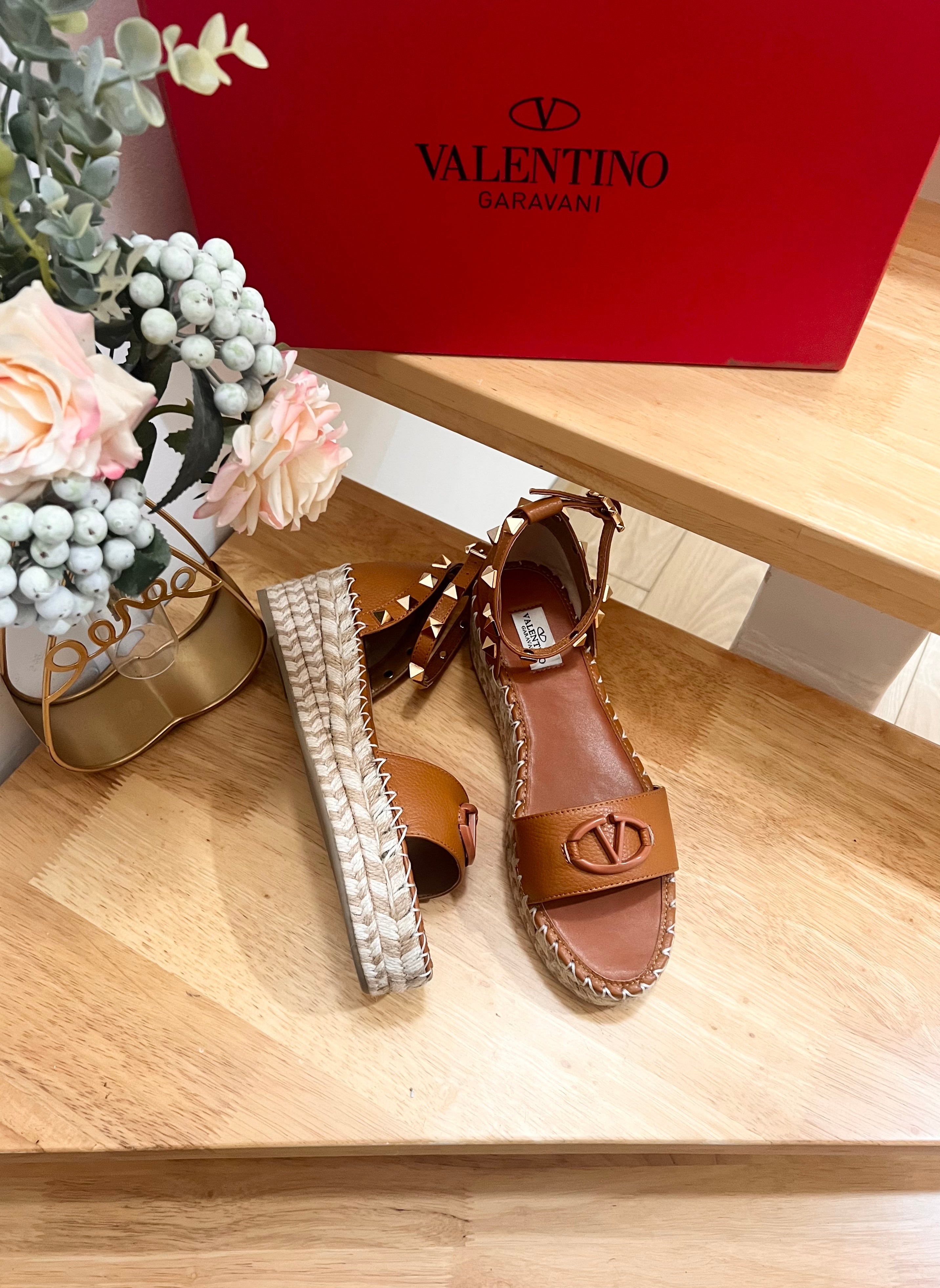 Valentino Rockstud Espadrille Sandals Brown Leather 240599