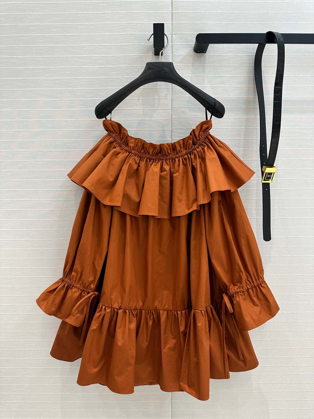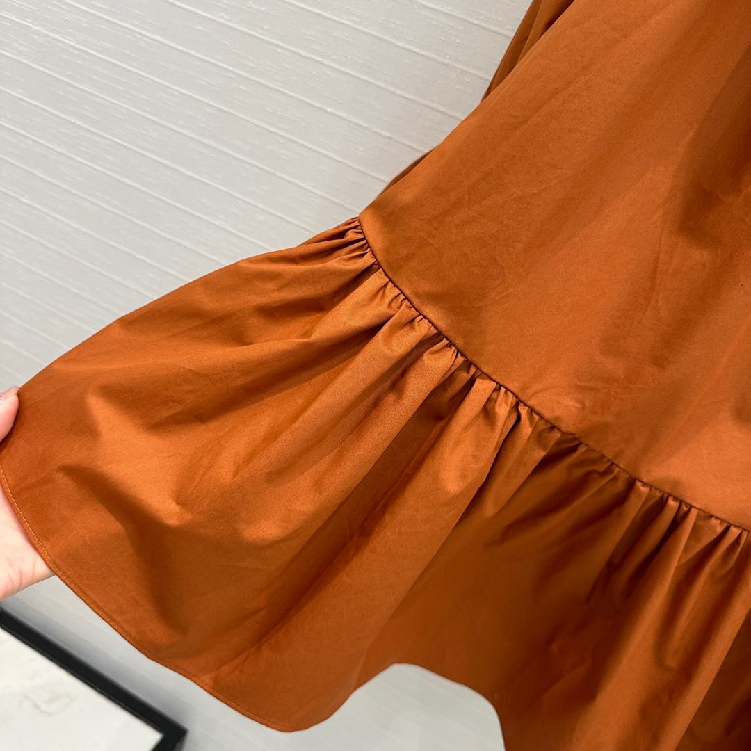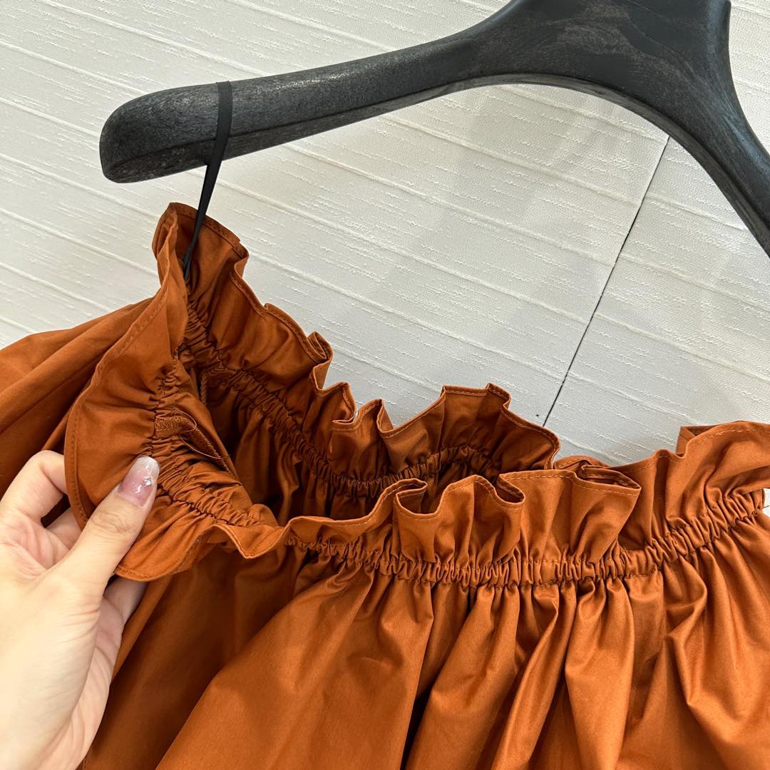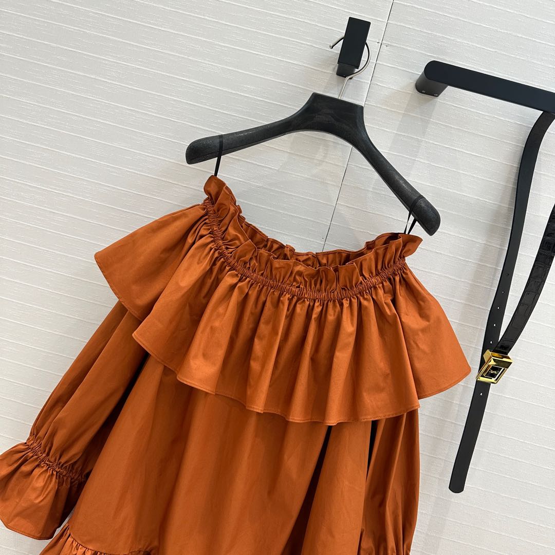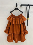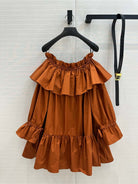 YSL One-shoulder Drawstring Puff Sleeve Dress Caramel Cotton