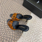 LA 16 HEELED MULES IN TIGER PATTERN RABBIT FUR
