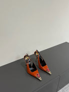 RED GEM-STUDDED SLINGBACK PUMPS IN ORANGE PATENT CALFSKIN
