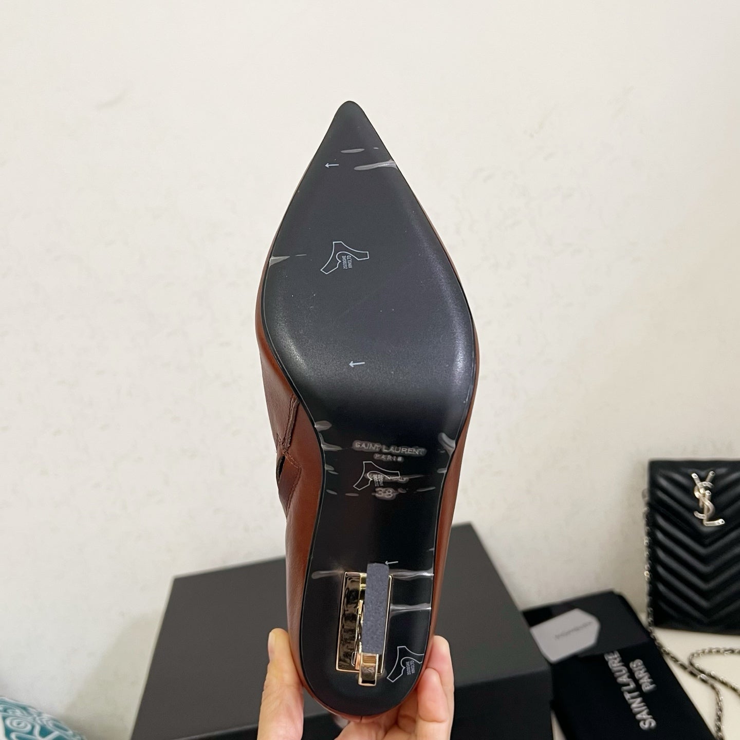 YSL 2025 Logo Metal Heel Ankle Boot Brown Cowhide 575004