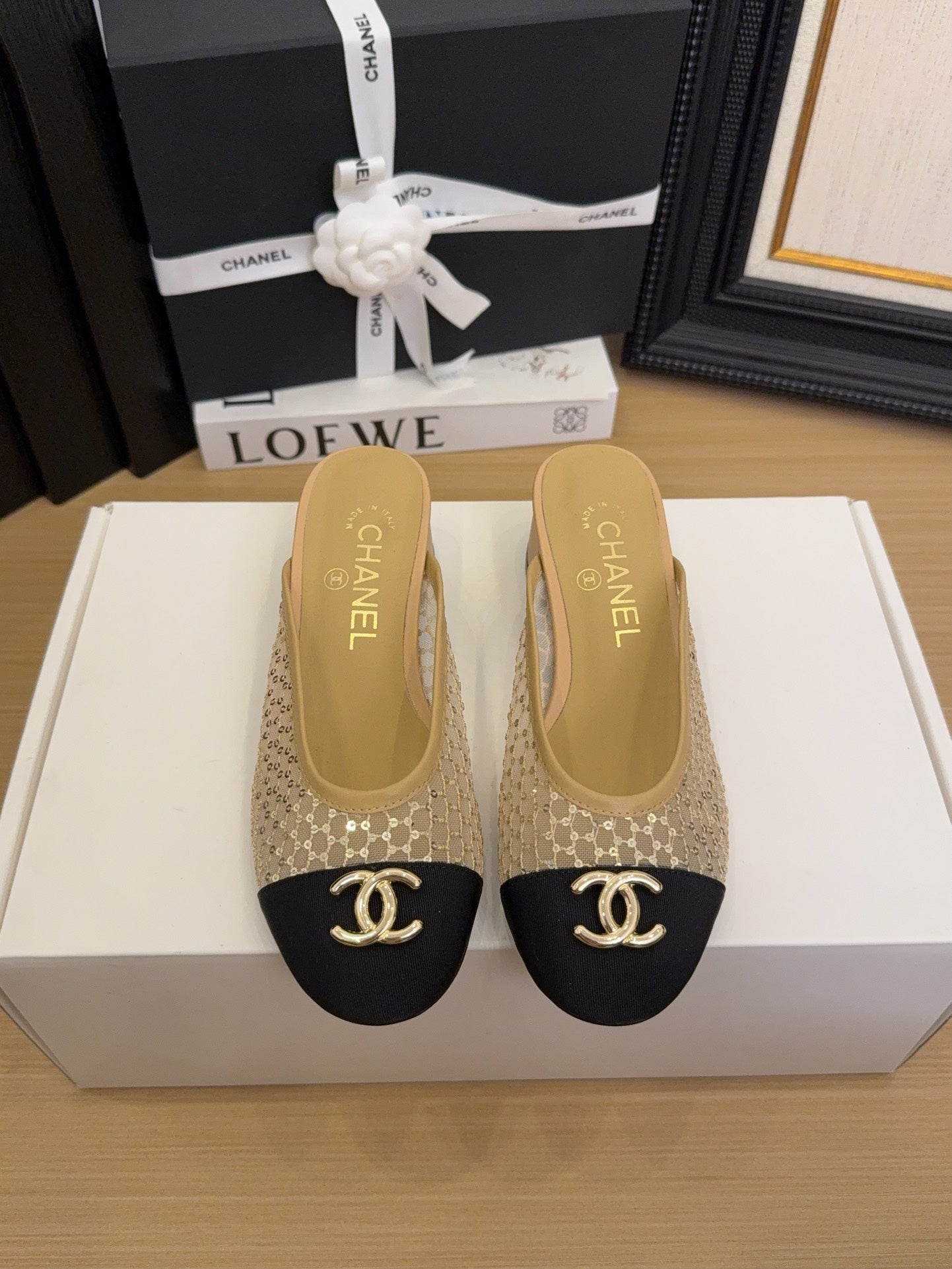 CC 25 Mule 40mm Beige Mesh Beige Sheepskin Black Grosgrain 277724