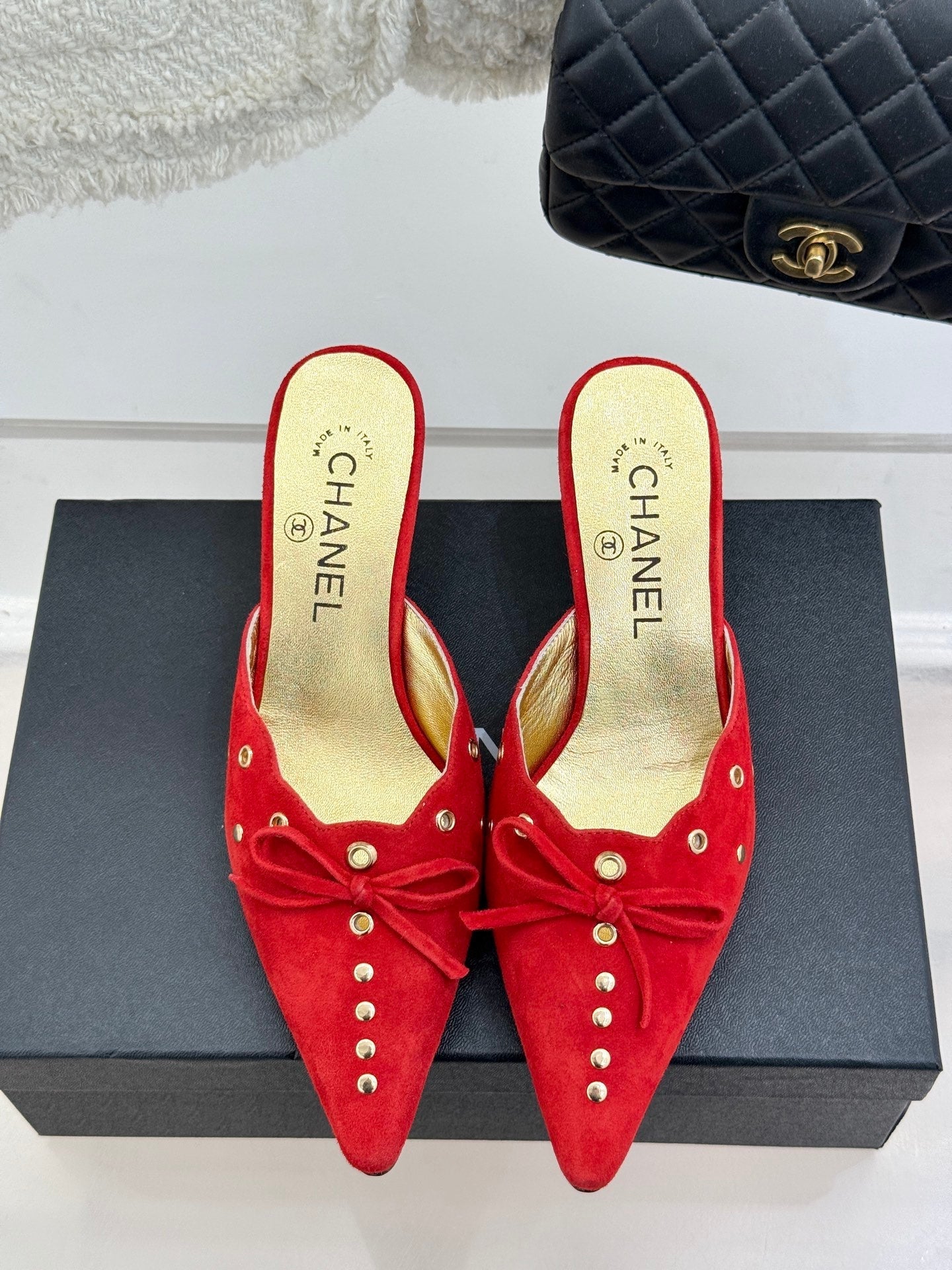 CC 25C Bowknot Pointed High Heel Half Slippers 60mm Red Suede 265658