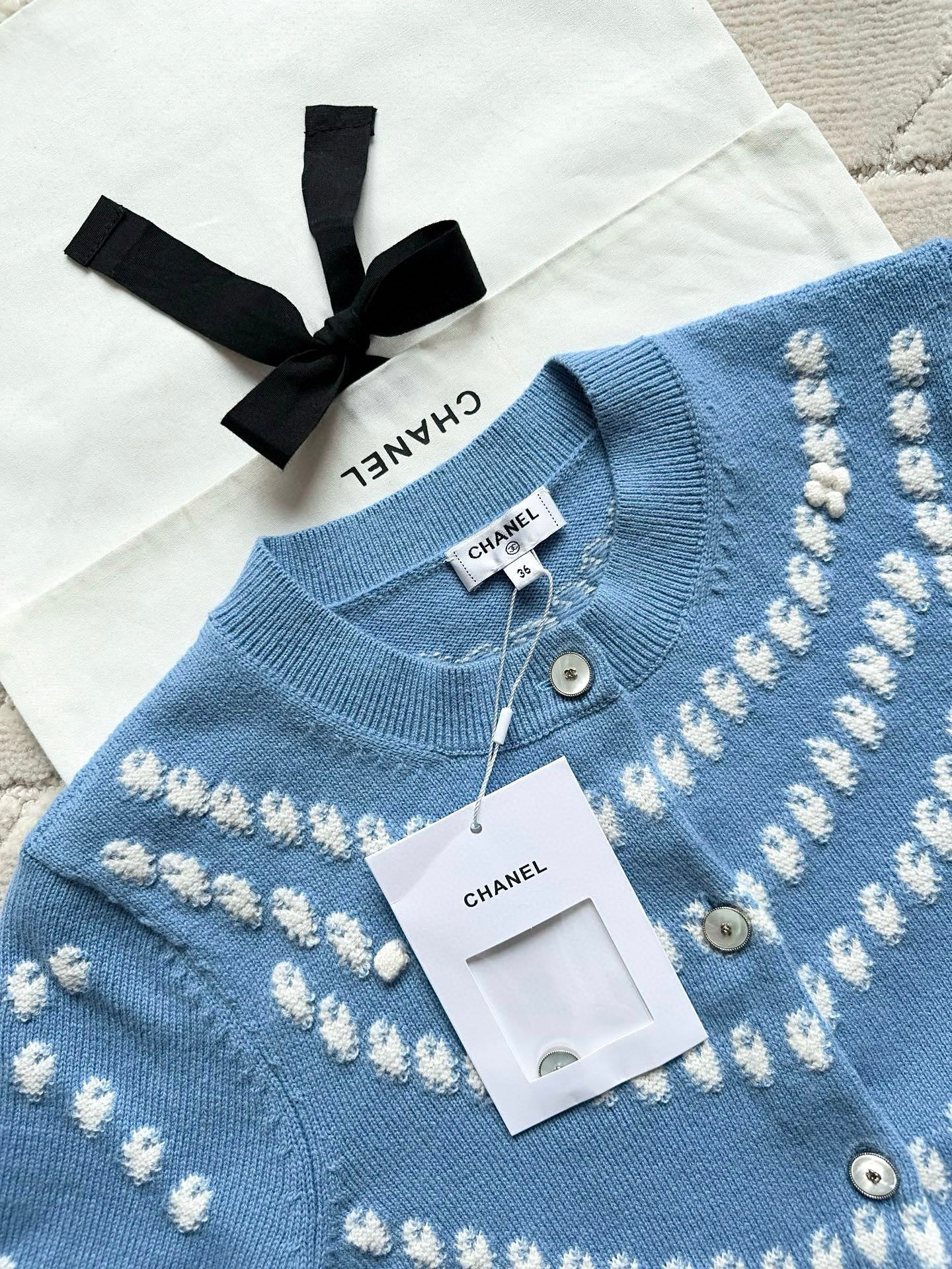 Chanel 25P Cardigan Light Blue Mix White Cashmere 237300