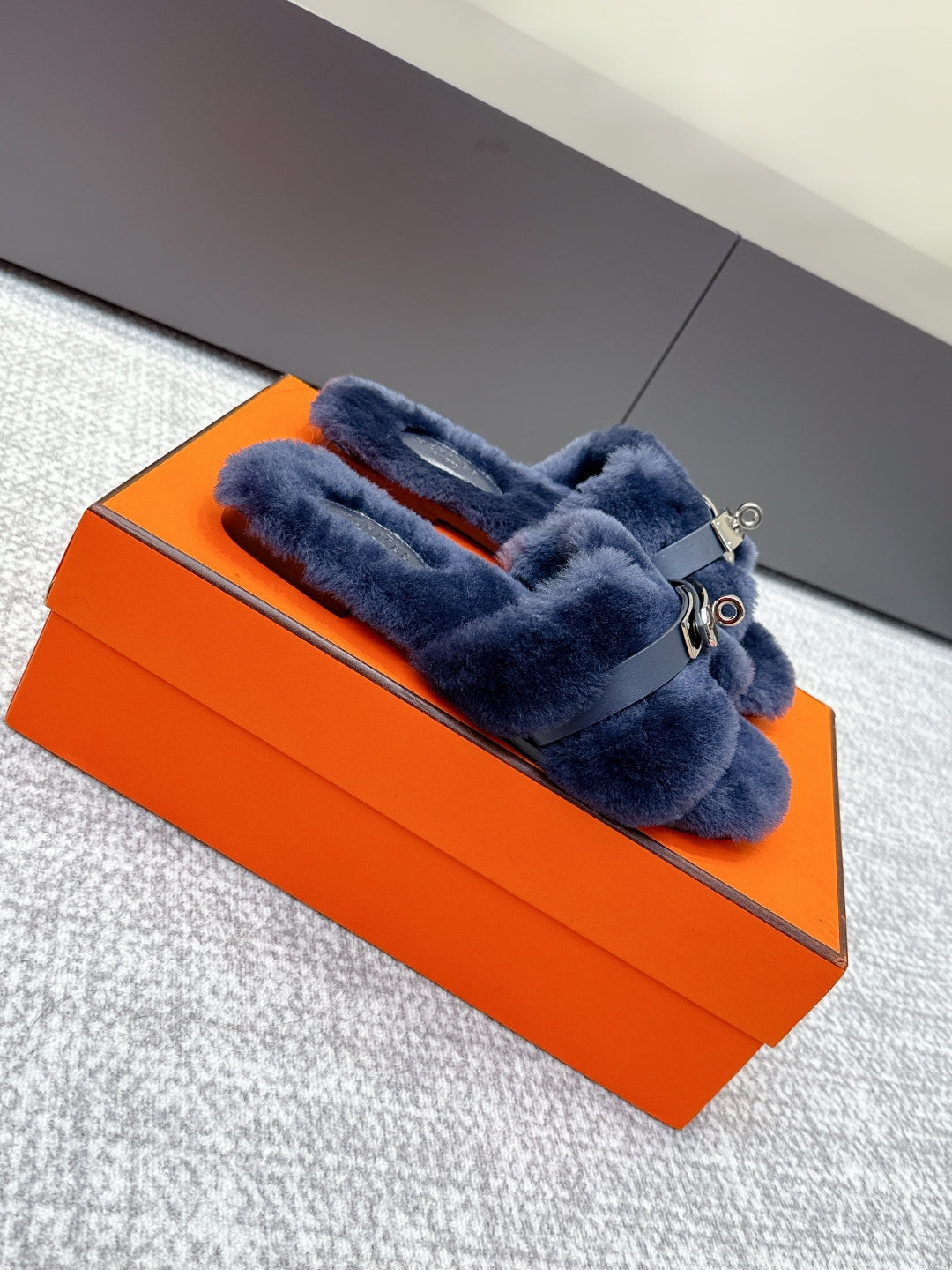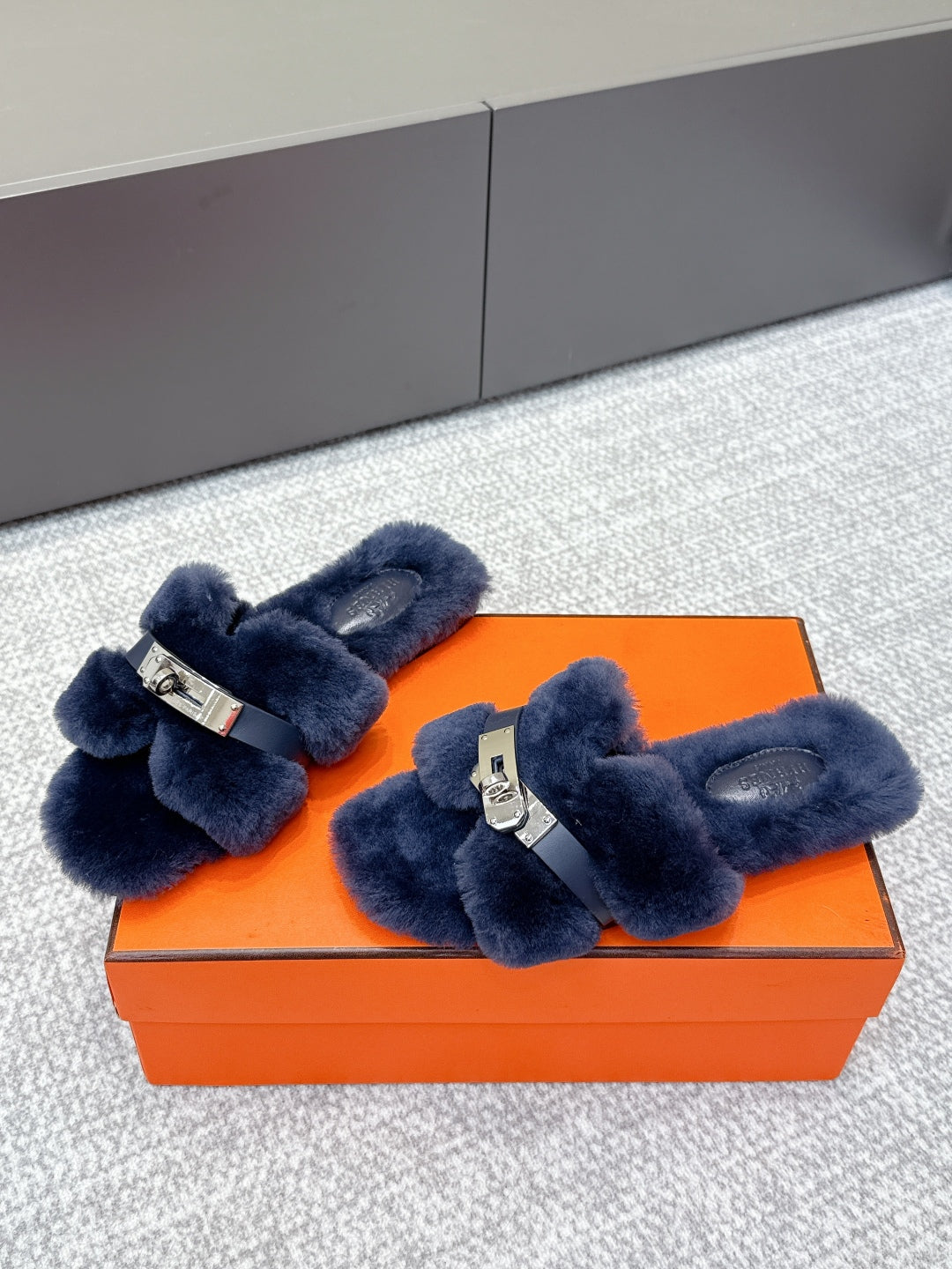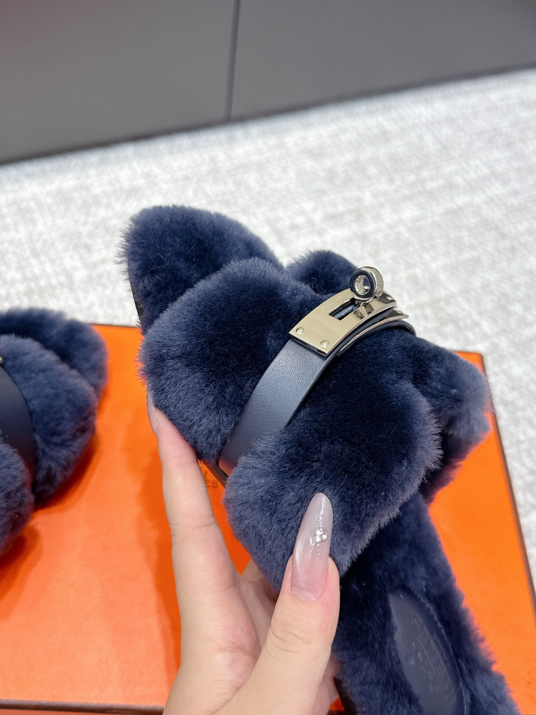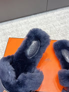 HM 25s H Shaped Slipper with Buckle Navy Blue Shearling 462192