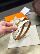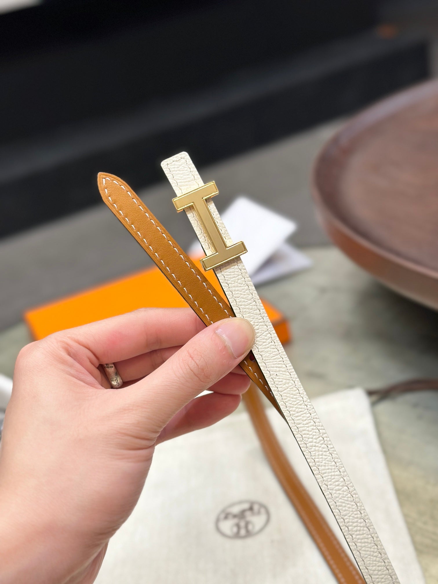 HM FOCUS BUCKLE & REVERSIBLE BRONZE BROWN AND WHITE LEATHER STRAP 13MM GOLD HARDWARE