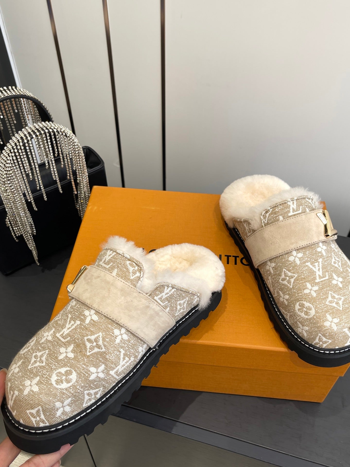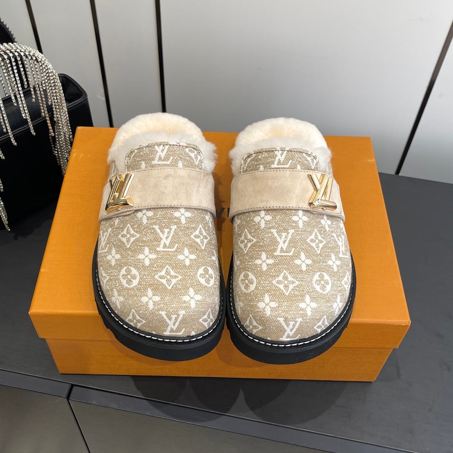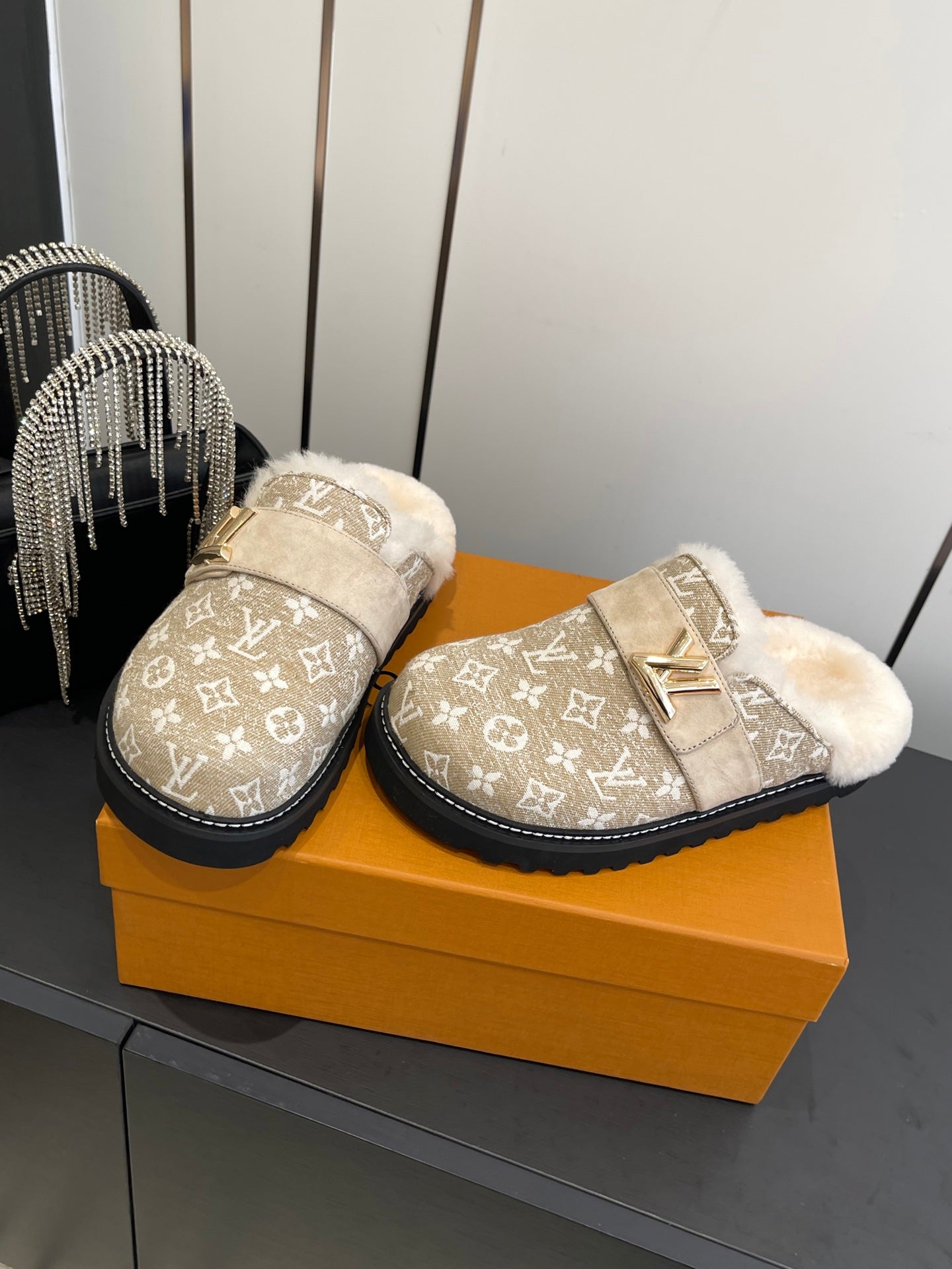 LV Cosy Flat Slippers Comfort Clog Beige Leather Monogram Fur 533469