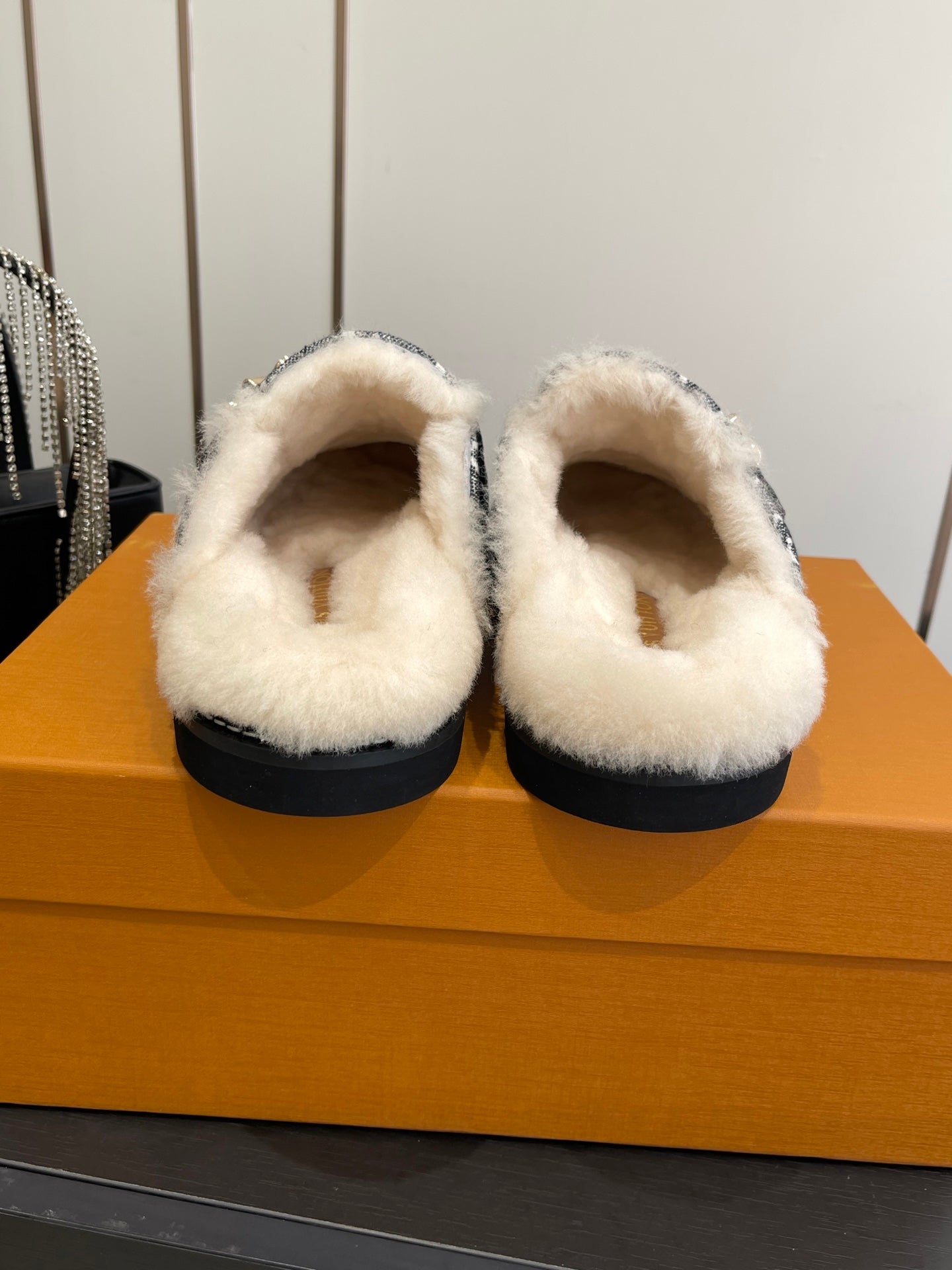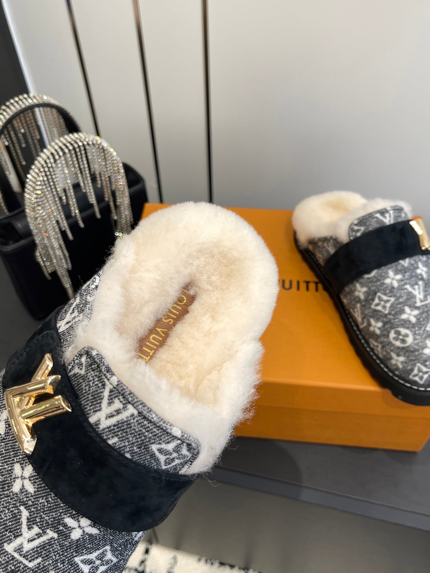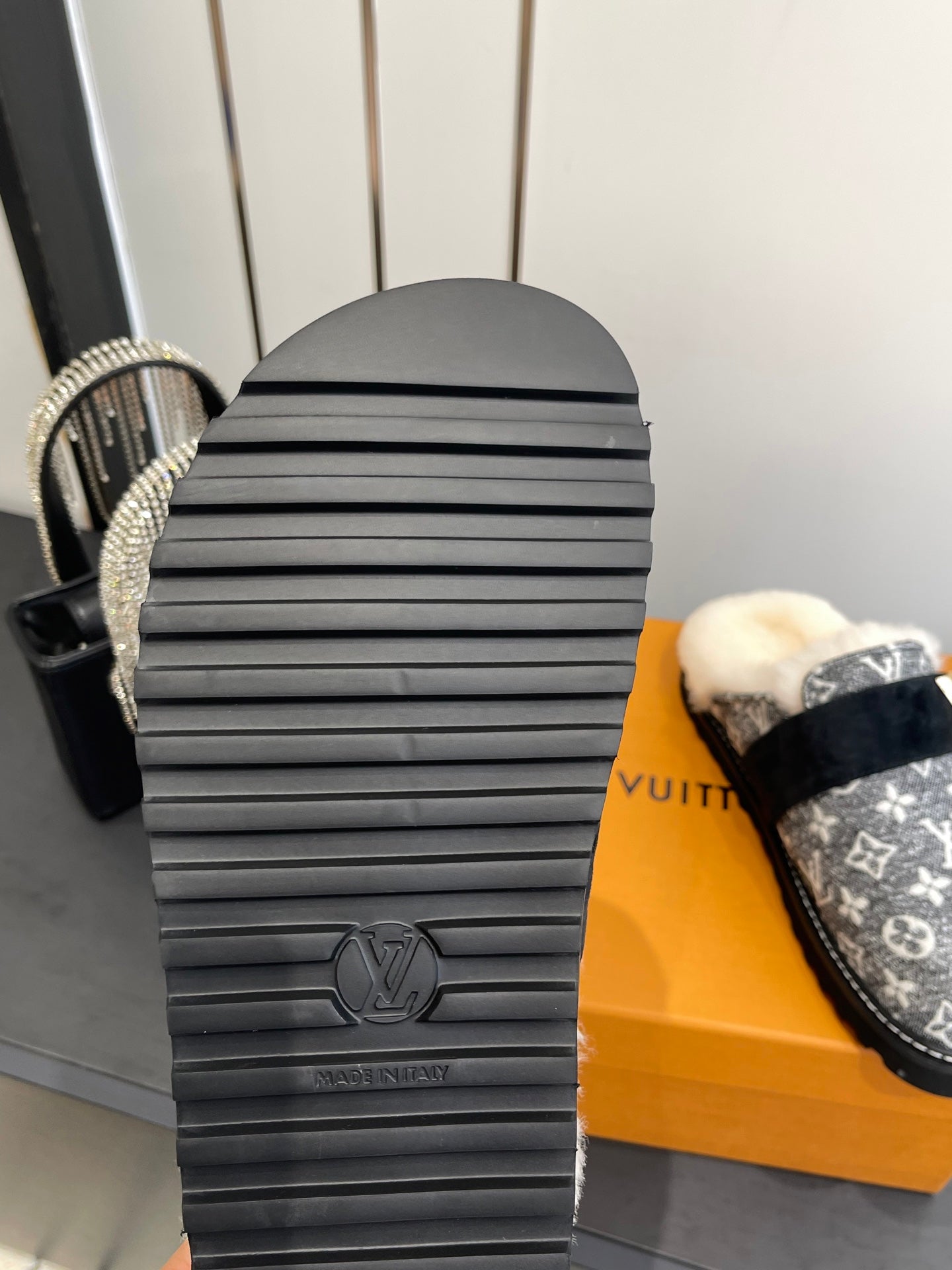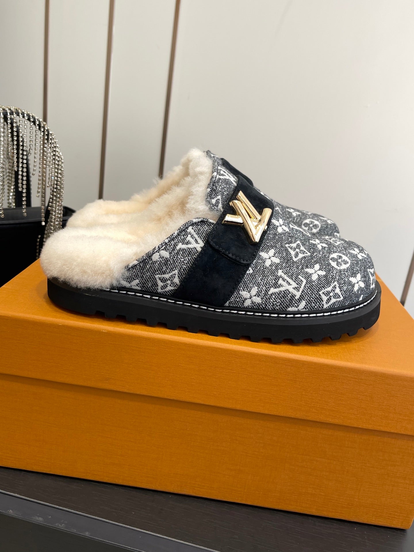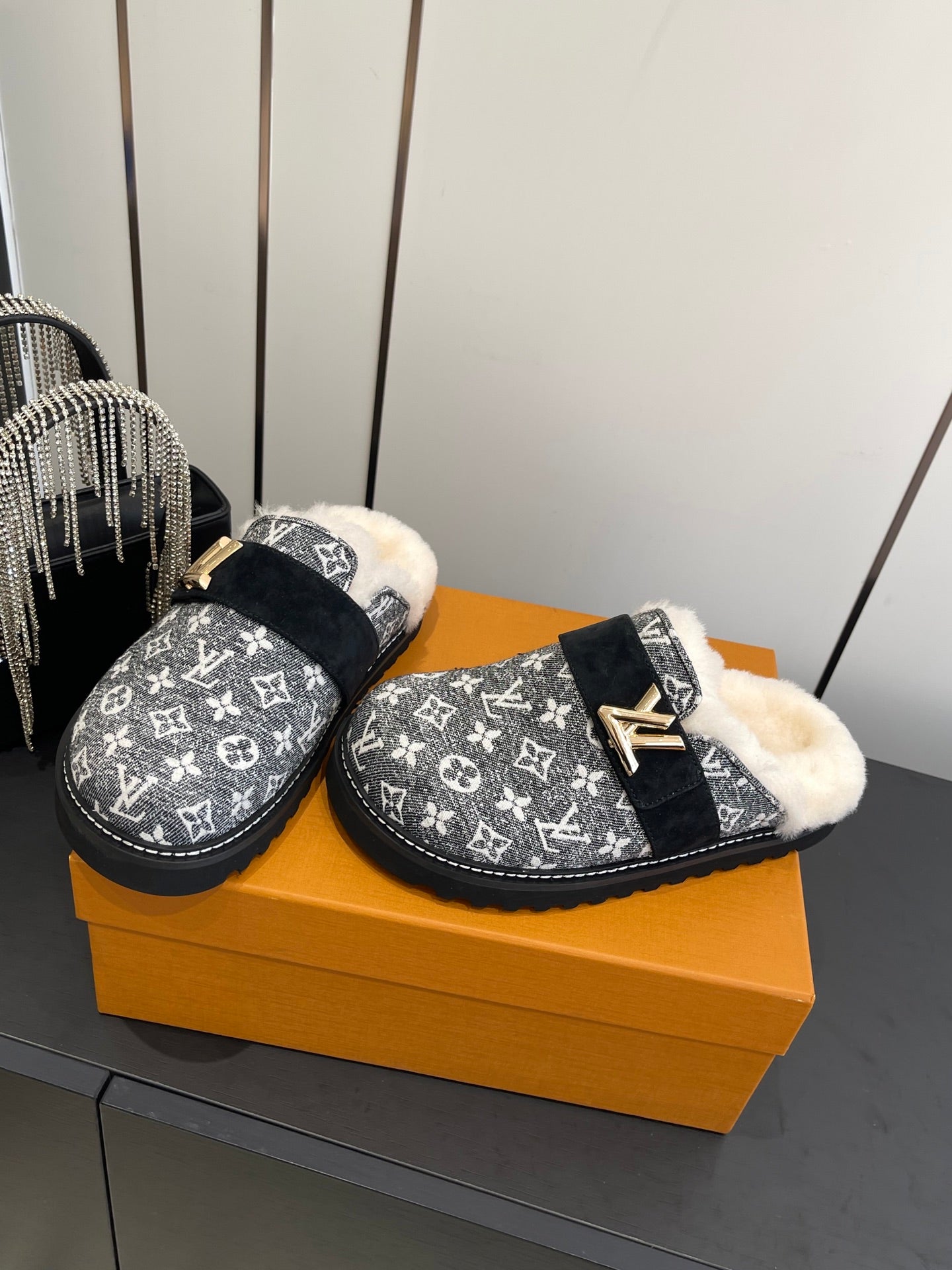 LV Cosy Flat Slippers Comfort Clog Black Grey BeigeLeather Monogram Fur 533468
