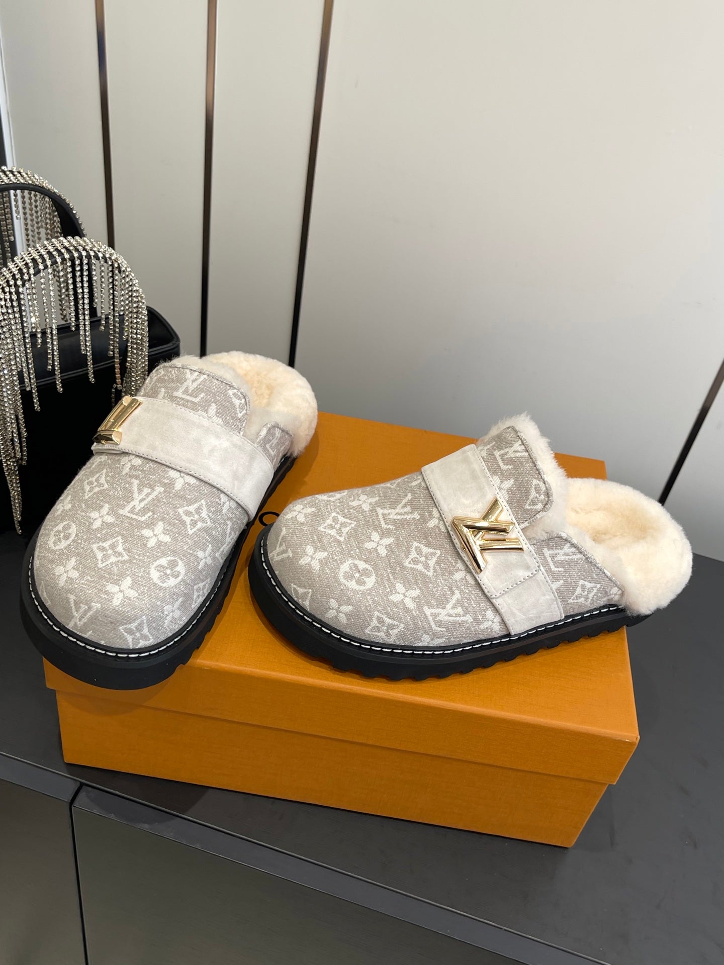 LV Cosy Flat Slippers Comfort Clog Light Khaki Beige Leather Monogram Fur 533470