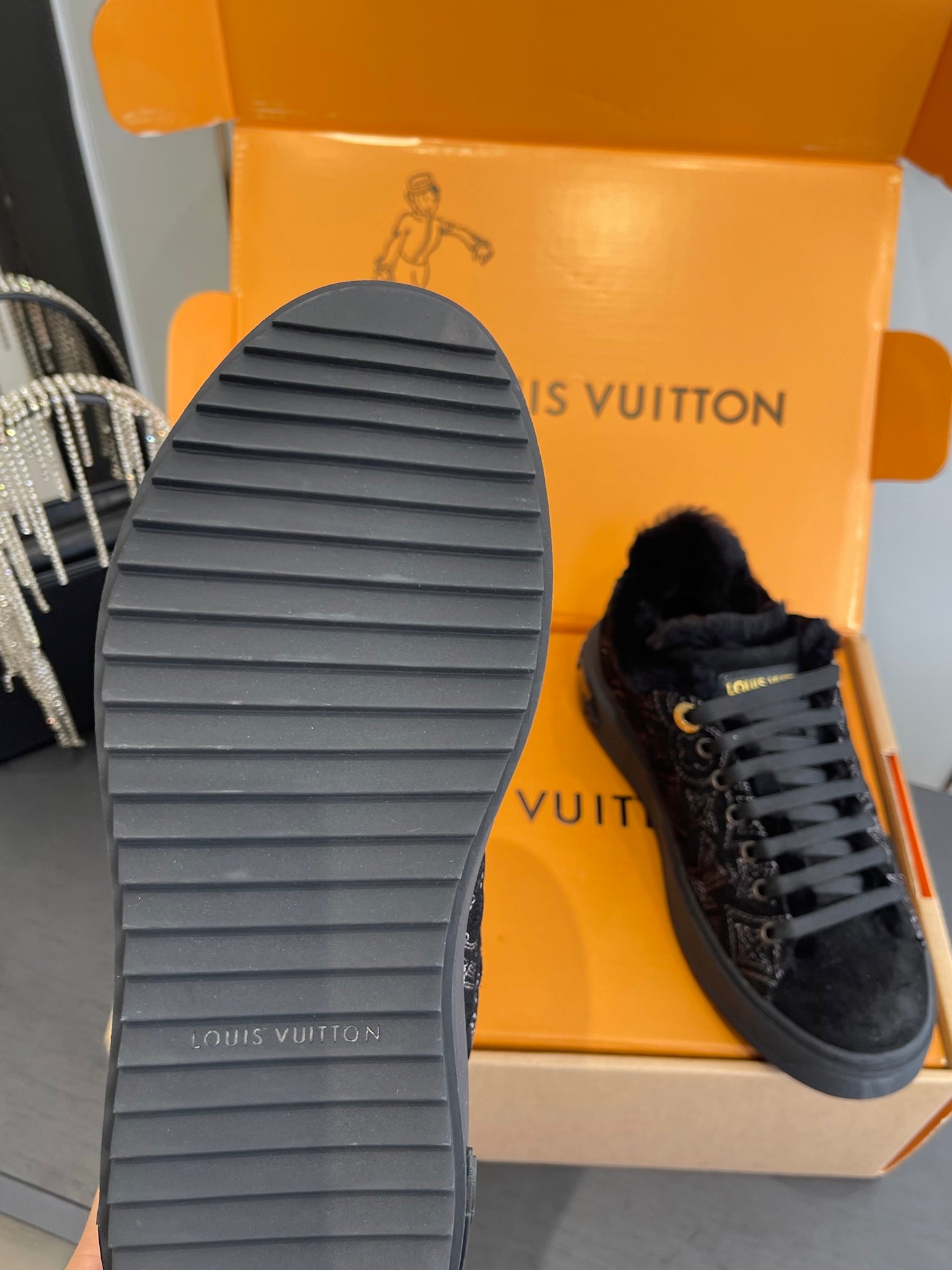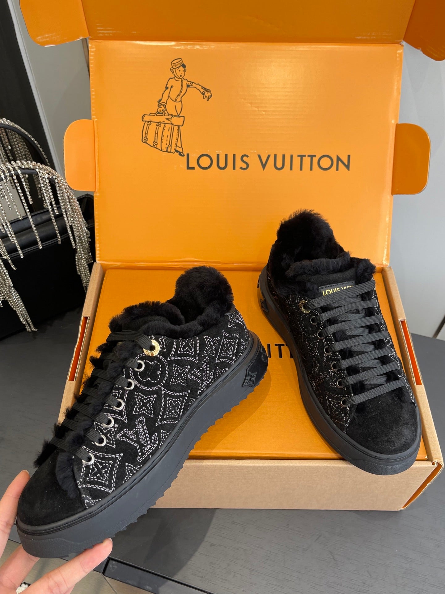 LV Time Out Sneaker 40mm Black Monogram Denim Suede Fleece Lined 533474